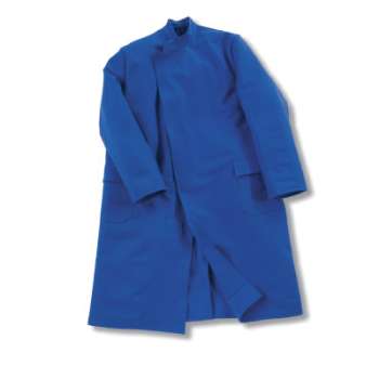 mit Stehkragen, Gehschlitz im Rücken, zweireihige Leiste mit verdeckten Klettverschlüssen, 2 große Seitentaschen mit Patte und verdecktem Druckknopf, 1 Brustinnentasche links, Vorderteil dreilagig bis zur diagonalen Teilungsnaht, Vorderärmel doppelt